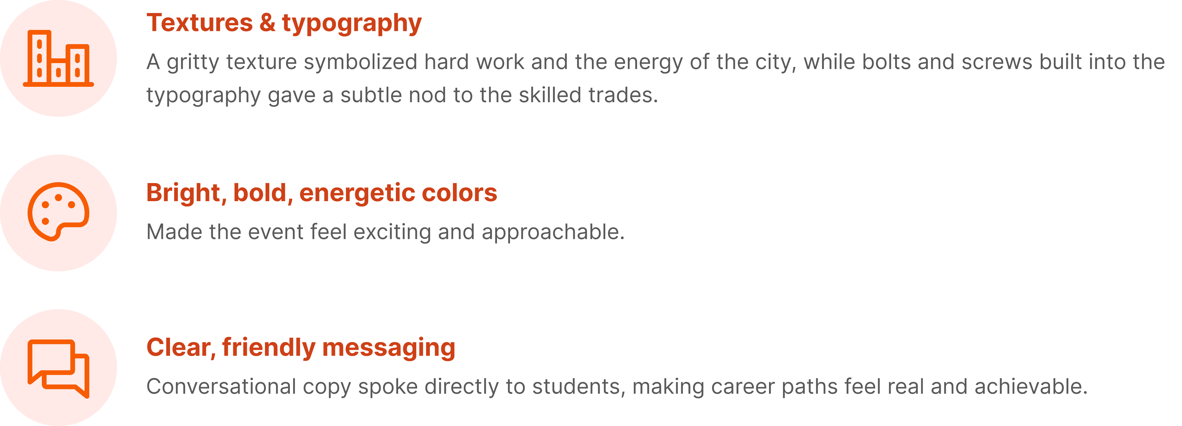 My challenge? Create a bold, energetic identity that would grab students' attention, spark curiosity, and make skilled trades feel like an exciting future—not just an alternative.